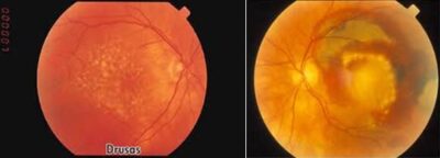 Na foto à esquerda, drusas maculares. À direita, doença macular relacionada à idade do tipo úmida (exsudativa).